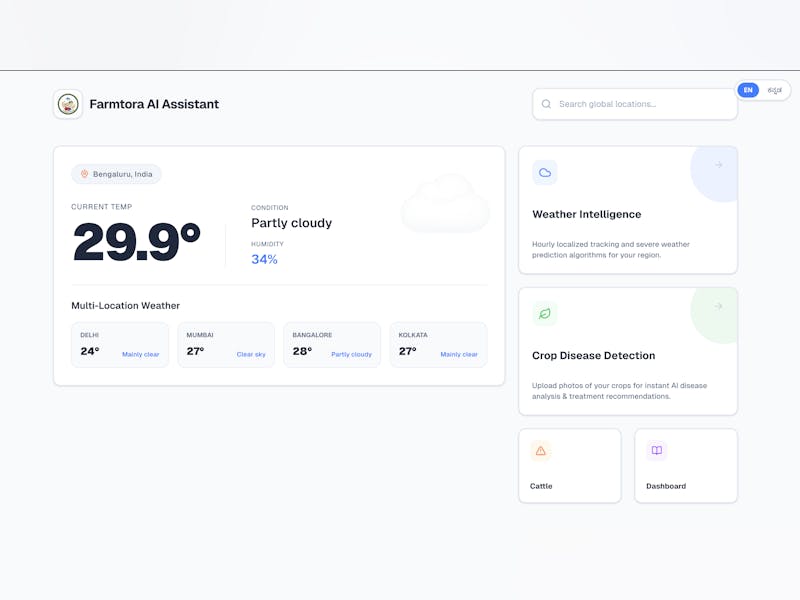 Farmtora is a multilingual web platform that provides real-time weather updates and AI-powered plant and animal disease detection for farmers.